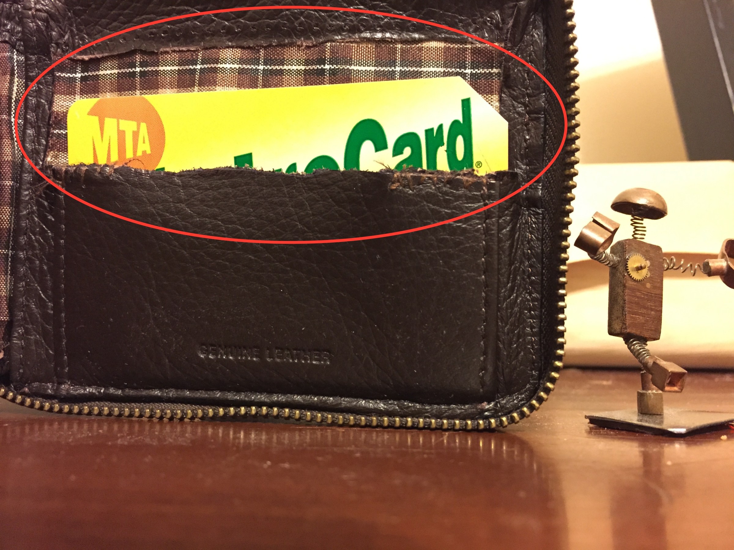 Notice the area in the red oval. My wavy cutting and uneven stitching underscore The Customizer’s look. Of course, many readers will quickly understand that there used to be a snap-covered coin pocket where the Metro card now rests. Those pesky coin pockets are too bulky and ruin the lines of the wallet. The answer is always customize! Now I have an extra card slot.