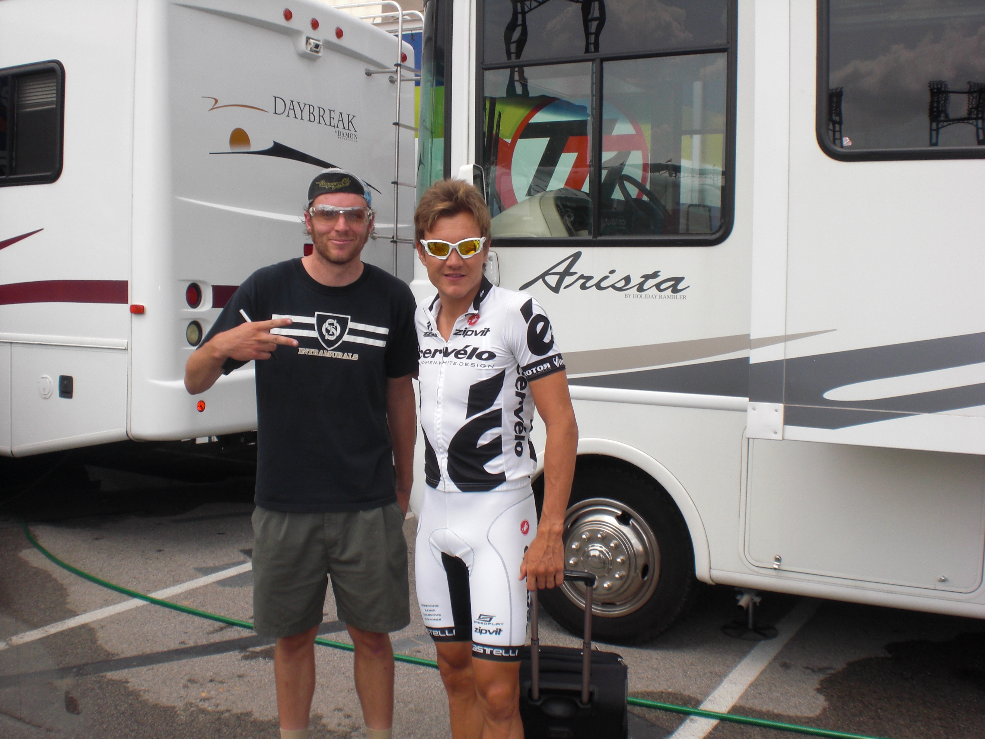 We wanted to get a pic of another Saxo Bank rider, Jason McCartney, but he was running late and sprinted out of the bus, onto his bike, and was gone–but not before he gave us an Iowa City Wussup nod. Yeah, we know big-time cyclists!