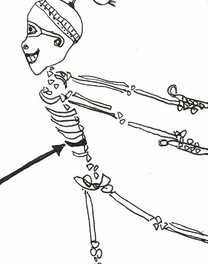 But that doesn’t mean that I can’t whip up a fury of ski-skizzle on the Korte’s wuu-whizzle. Some fans have inquired about the exact position of my rib “event”. So, in case there are any physicians in the house, here is a technical drawing that I made of an imaginary X-Ray of me skate skiing with my glasses and my hat on.